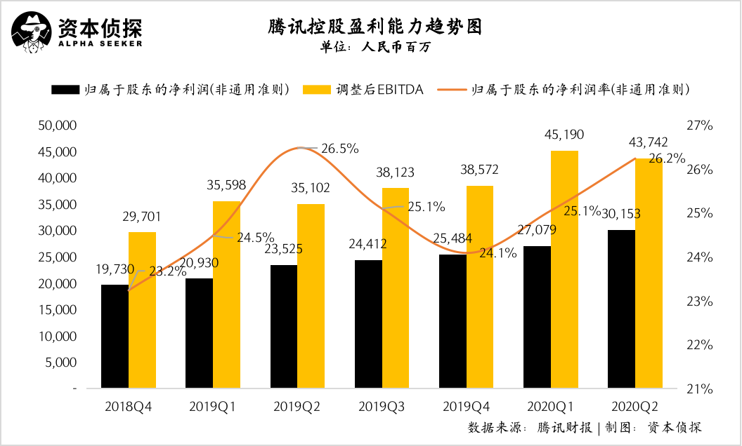 從財(cái)務(wù)表現(xiàn)可以看出,騰訊的盈利能力得到進(jìn)一步優(yōu)化。財(cái)報(bào)顯示,本季度騰訊調(diào)整后EBITDA為437.42億,歸屬于股東的凈利潤(rùn)率連續(xù)三個(gè)季度呈上升趨勢(shì),本季度達(dá)26.2%。