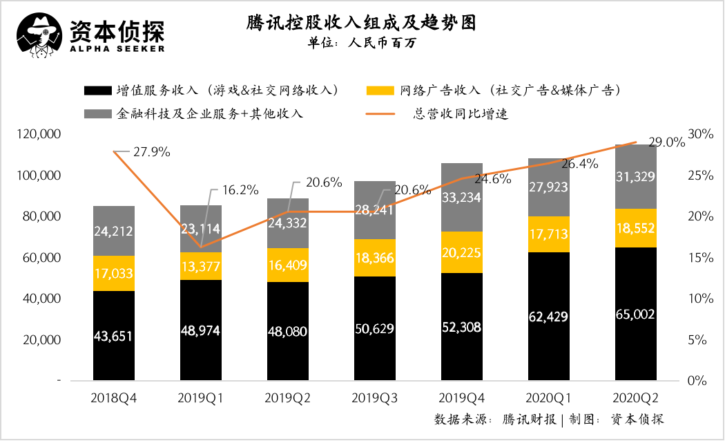 • 2020年二季度,騰訊增值服務(wù)業(yè)務(wù)的收入同比增長(zhǎng)35%至人民幣650.02億元。